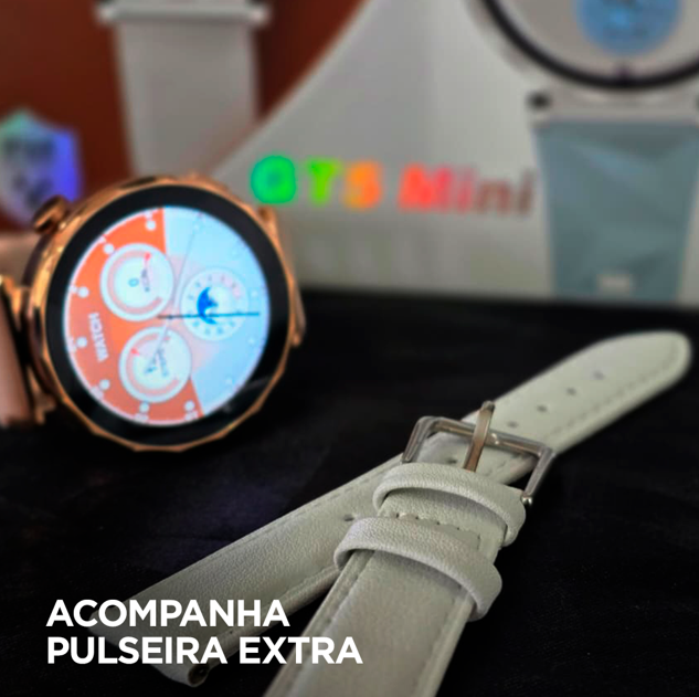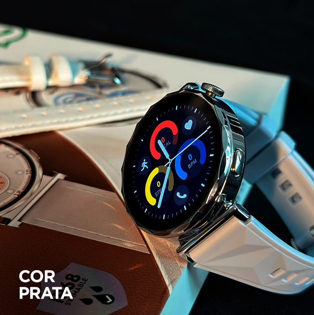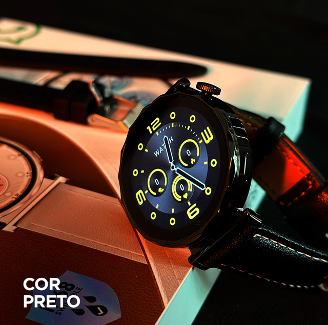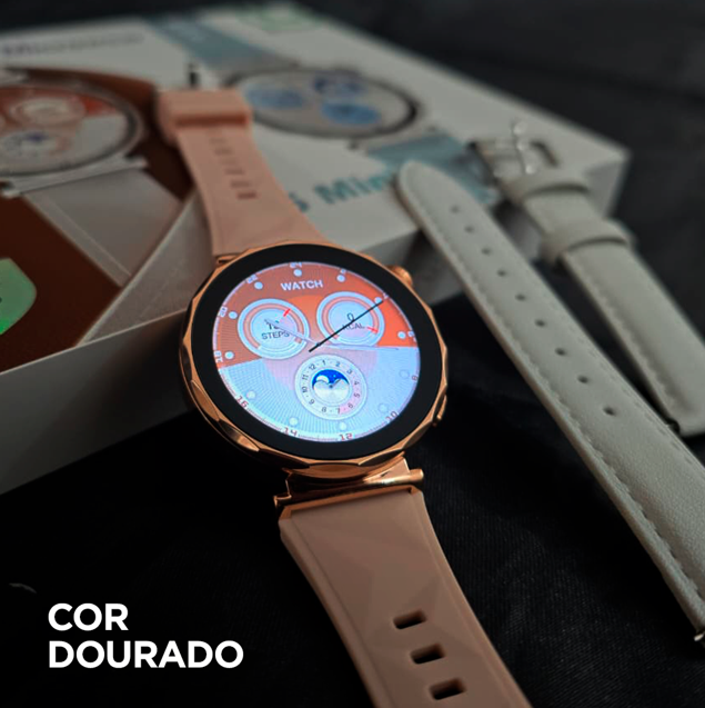 Compacto e leve, o smartwatch mede 41 mm de largura e altura, com apenas 10,7 mm de espessura, pesando cerca de 45 g. Seu design arredondado e ergonômico é perfeito para uso diário, esportes e viagens.